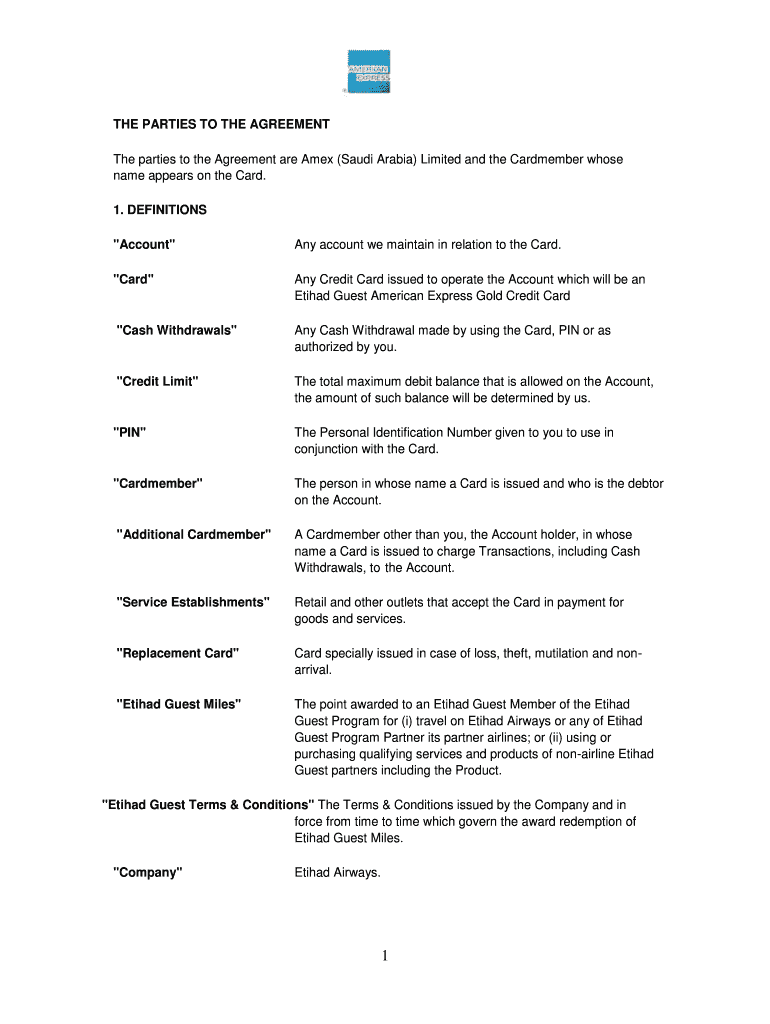 THE PARTIES TO THE AGREEMENT The parties to the Agreement are Amex (Saudi Arabia) Limited and the Card member whose name appears on the Card. 1. DEFINITIONS Account Any account we maintain in relation