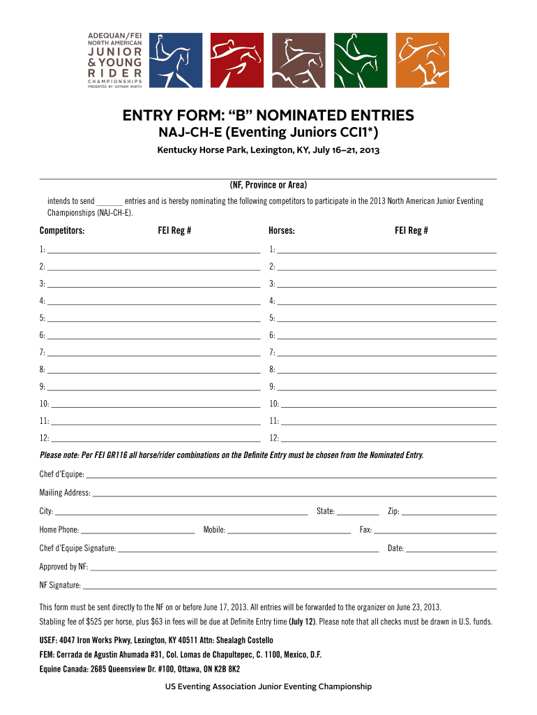 ENTRY FORM: B Nominated Entries CACHE (Eventing Juniors CCI1*) Kentucky Horse Park, Lexington, KY, July 1621, 2013 (NF, Province or Area) intends to send entries and is hereby nominating the following