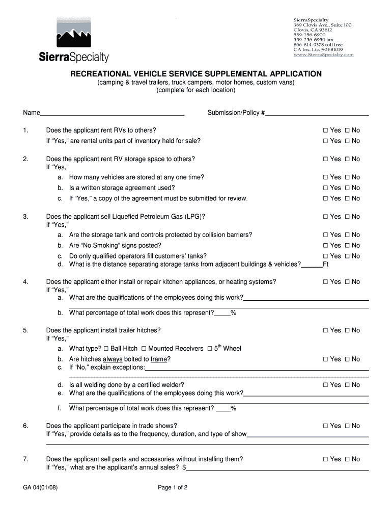 The Recreational Vehicle Service Supplemental Application includes various components aimed at gathering essential information from applicants. Key features of this form encompass: