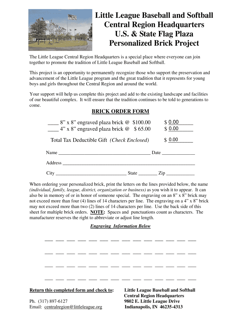 Little League Baseball and Softball Central Region Headquarters U.S. & State Flag Plaza Personalized Brick Projects The Little League Central Region Headquarters is a special place where everyone