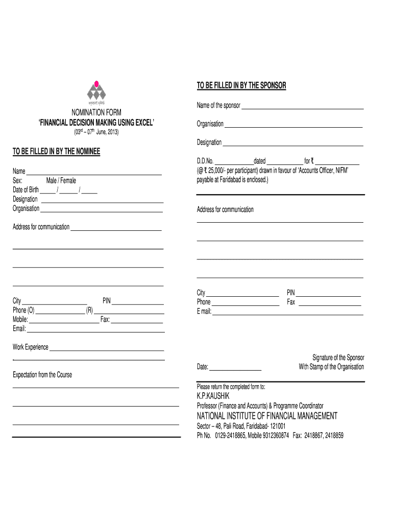 TO BE FILLED IN BY THE SPONSOR NOMINATION FORM FINANCIAL DECISION MAKING USING EXCEL Name of the sponsor Organization (03rd 07th June 2013) Designation TO BE FILLED IN BY THE NOMINEE Name Sex: Male