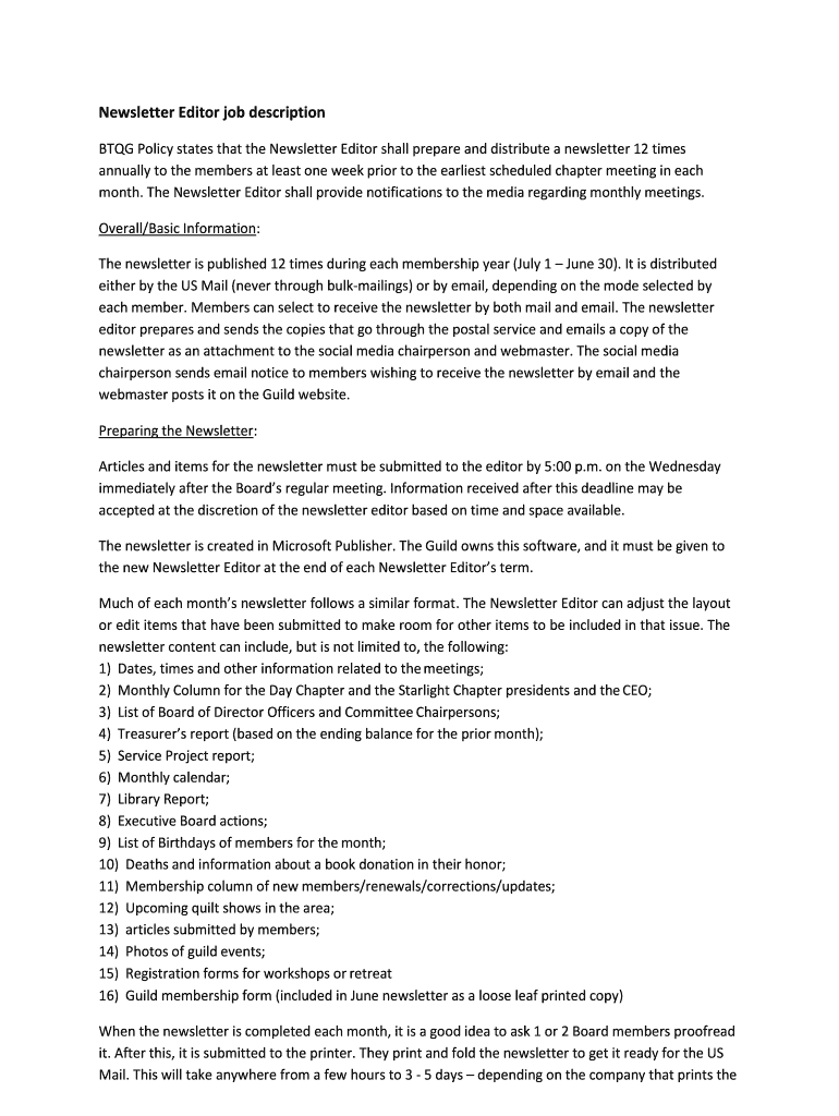 Newsletter Editor job description BTG Policy states that the Newsletter Editor shall prepare and distribute a newsletter 12 times annually to the members at least one week prior to the earliest scheduled