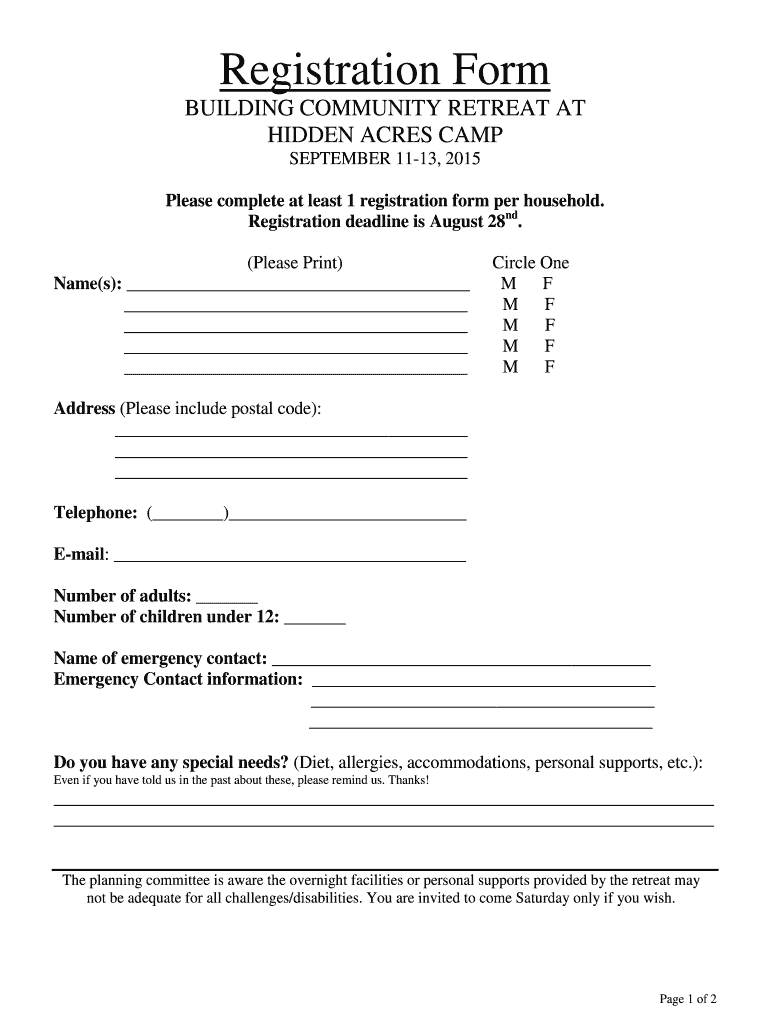 Registration Form BUILDING COMMUNITY RETREAT AT HIDDEN ACRES CAMP SEPTEMBER 1113, 2015 Please complete at least 1 registration form per household. Registration deadline is August 28th. (Please Print)