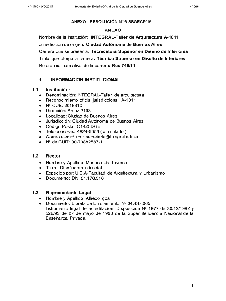 N 4593 6×3/2015 Separate del Boleyn Official de la Ciudad de Buenos Aires N 888 NEXT RESOLUTION N 6SSGECP×15 NEXT Hombre DE la Institution: INTEGRALTaller de Arquitectura A1011 Jurisdiction DE origin: