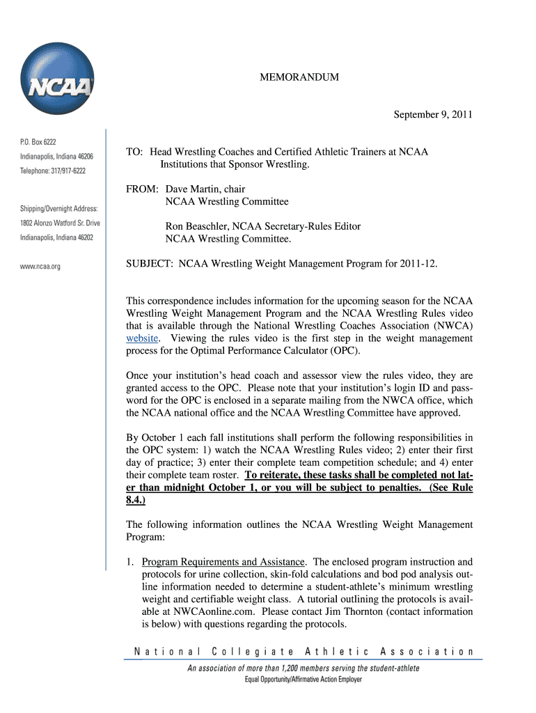 This memorandum outlines the responsibilities and requirements for NCAA institutions participating in the Wrestling Weight Management Program for the 2011-12 season, including accessing instructional
