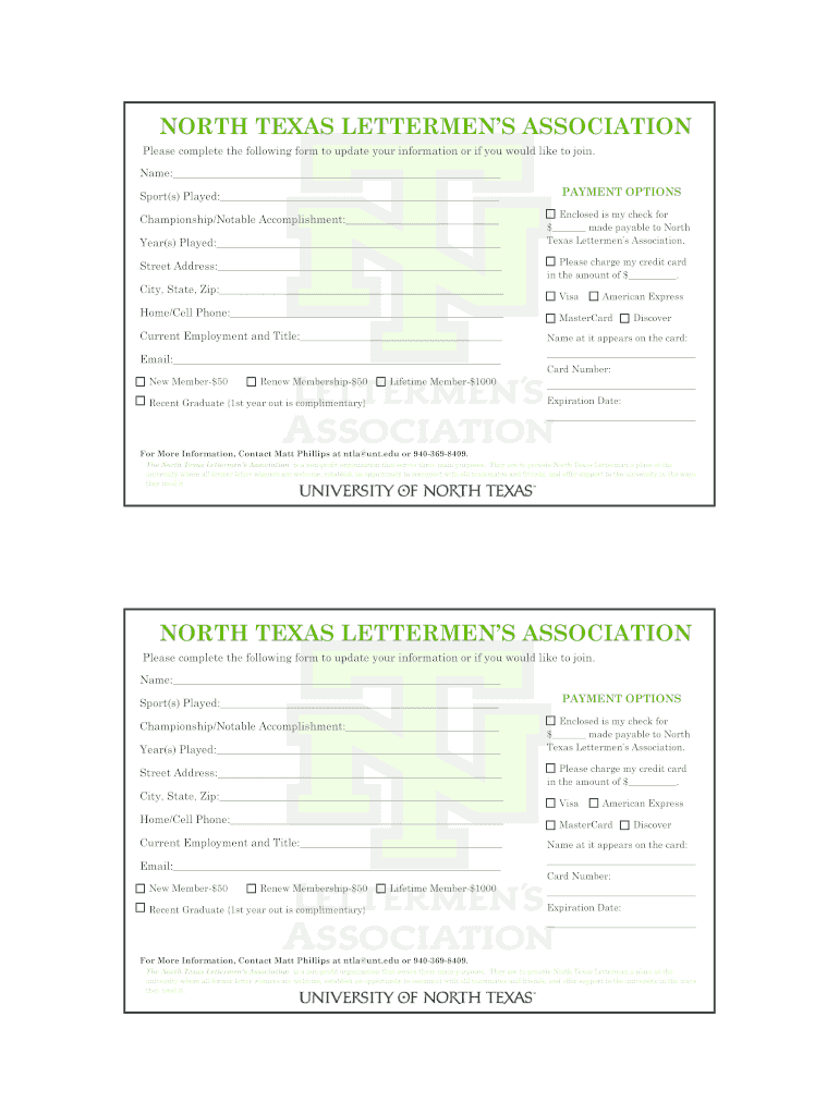 This form is used to update information or to join the North Texas Lettermen's Association, a non-profit organization providing support and community for former letter winners at the university.