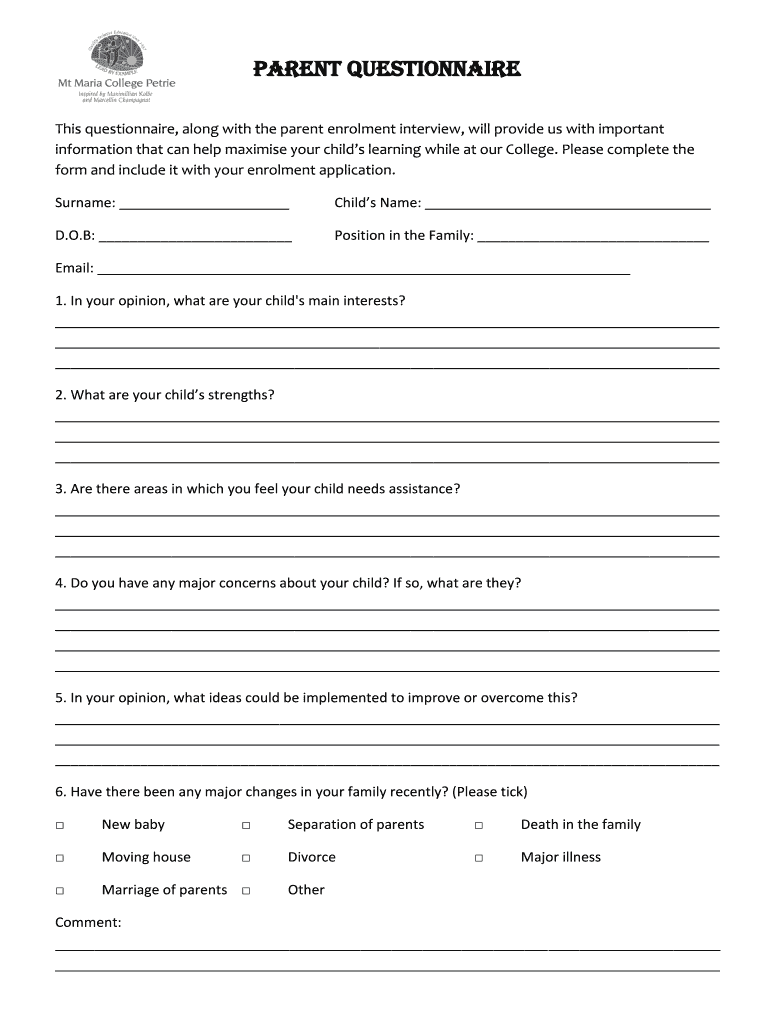 Parent Questionnaire This questionnaire, along with the parent enrollment interview, will provide us with important information that can help maximize your children learning while at our College.