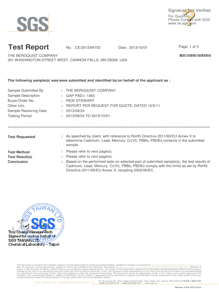 Fly signed by wmholetech. 2013.10.01 :45 CST Signature Not Verified For Question, Please Contact with SGS www.tw.sgs.com Test Report No. CE 2013 94153 Page: 1 of 5 Date : 2013 10/01 *CE 2013 94153*