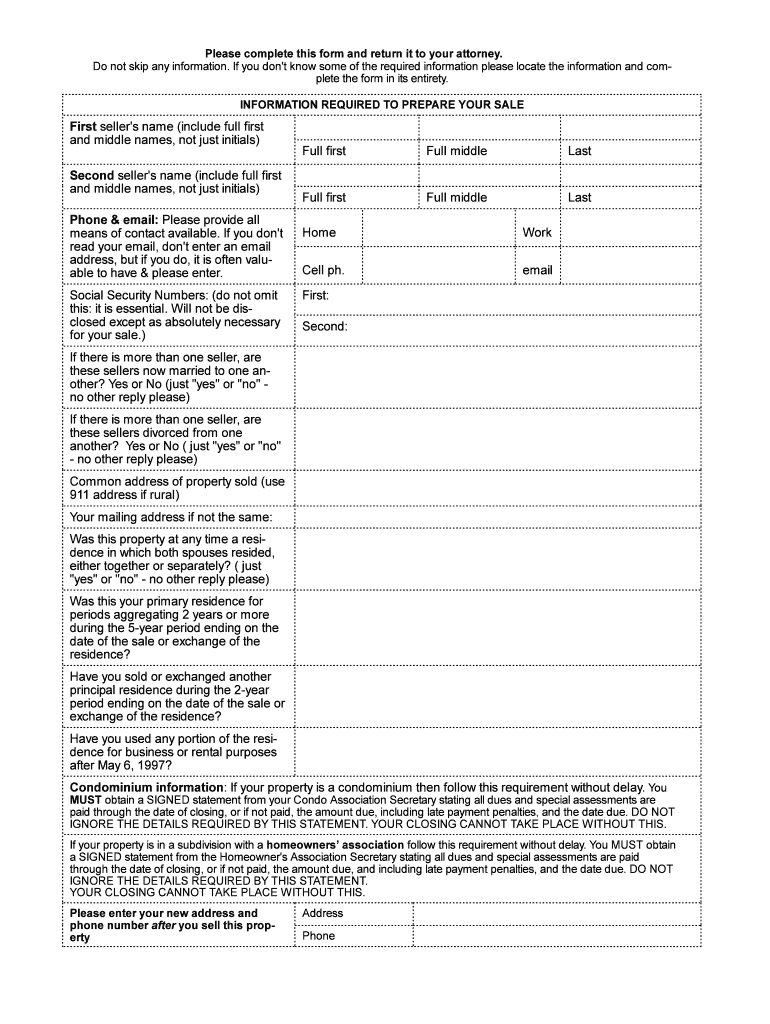 Seller Information Formulas complete this form and return it to your attorney. Do not skip any information. If you don 't know some required information please locate the information and complete