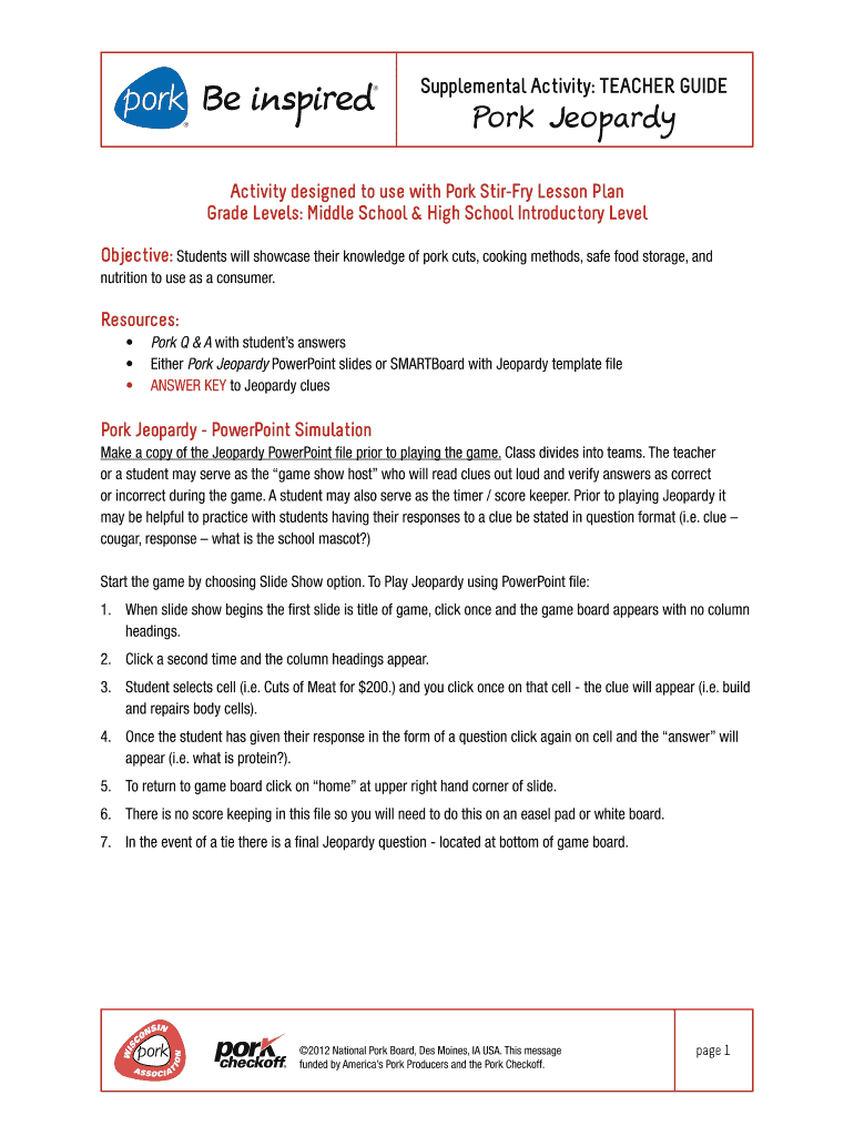 Supplemental Activity: Teacher Guidebook Jeopardy Activity designed to use with Pork Stir Fry Lesson Plan Grade Levels: Middle School & High School Introductory Level Objective: Students will showcase