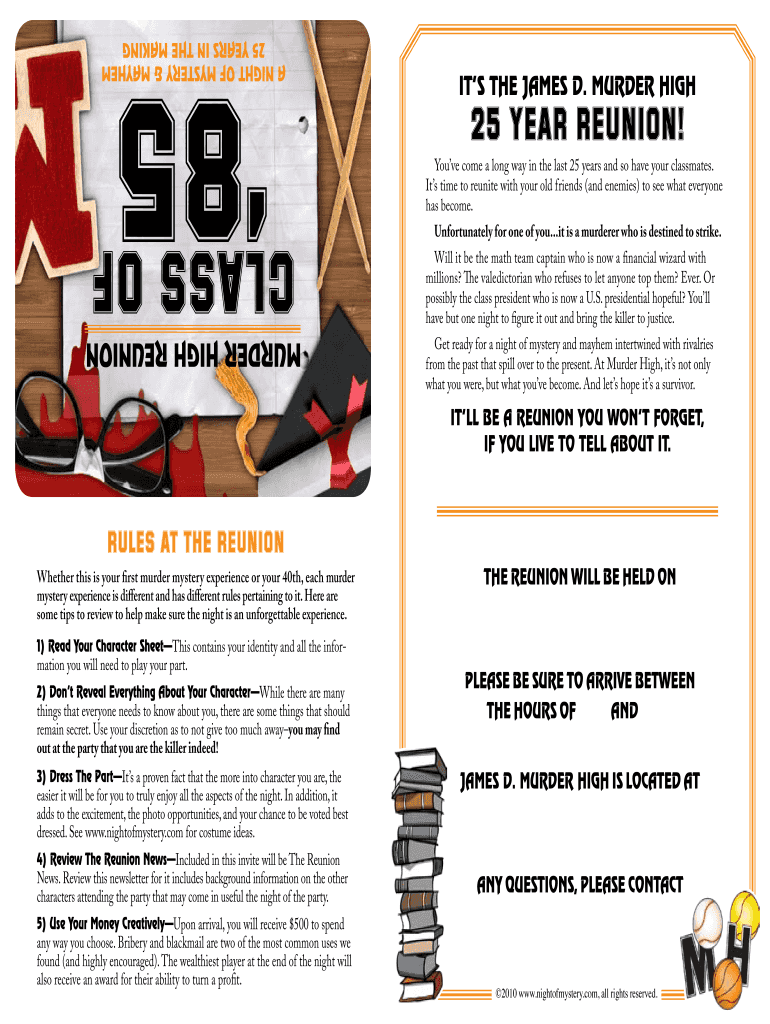 It's the jams d. Murder high 25 year reunion! A night of mystery & mayhem 25 years in the making You've come a long way in the last 25 years and so have your classmates. It's time to reunite with