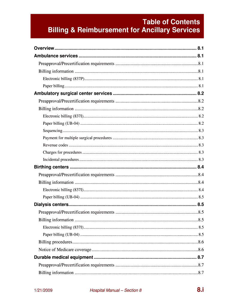 This section outlines billing requirements for various ancillary services such as ambulance services, ambulatory surgical centers, birthing centers, dialysis centers, home health, hospice, and others,