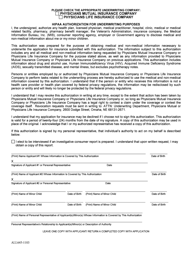 The HIPAA Authorization for Underwriting is a medical records release form used by applicants to authorize disclosure of medical information for underwriting purposes to Physicians Mutual Insurance Company or Physicians Life Insurance Company.
