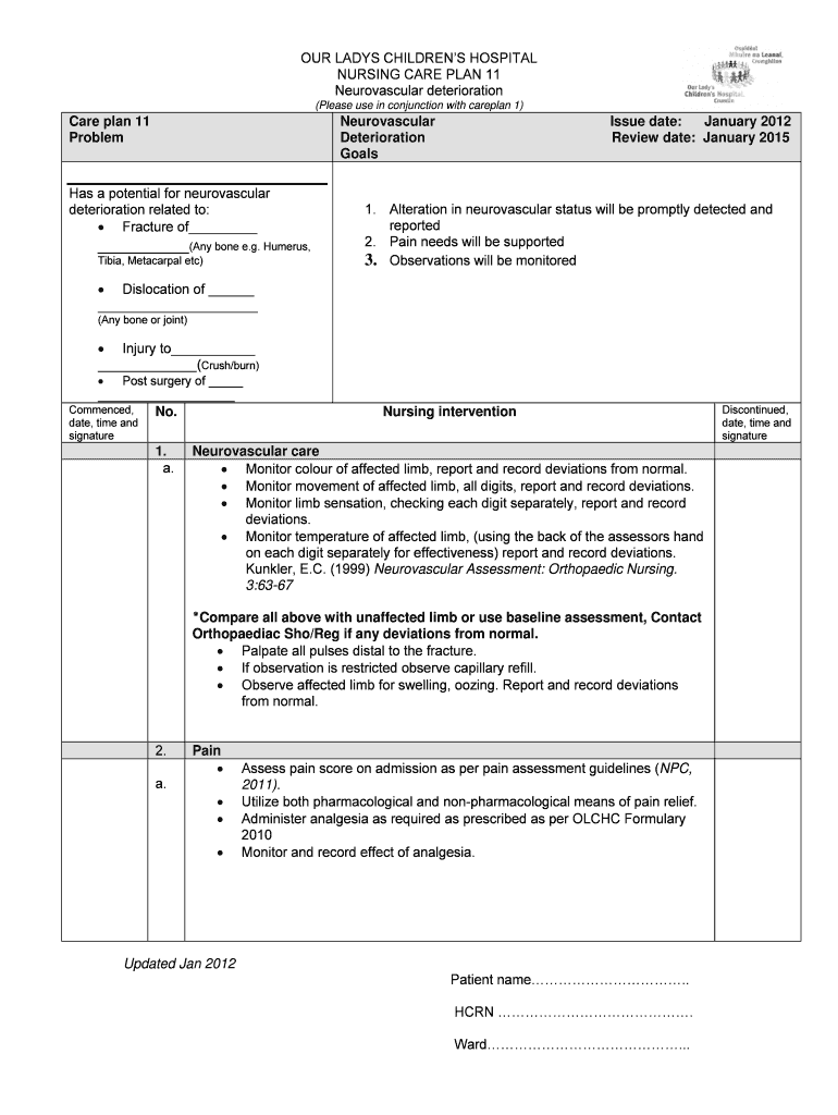 OUR LADY CHILDREN HOSPITAL NURSING CARE PLAN 11 Neurovascular deterioration (Please use in conjunction with care plan 1) Care plan 11 Problem Neurovascular Deterioration Goals Has a potential for