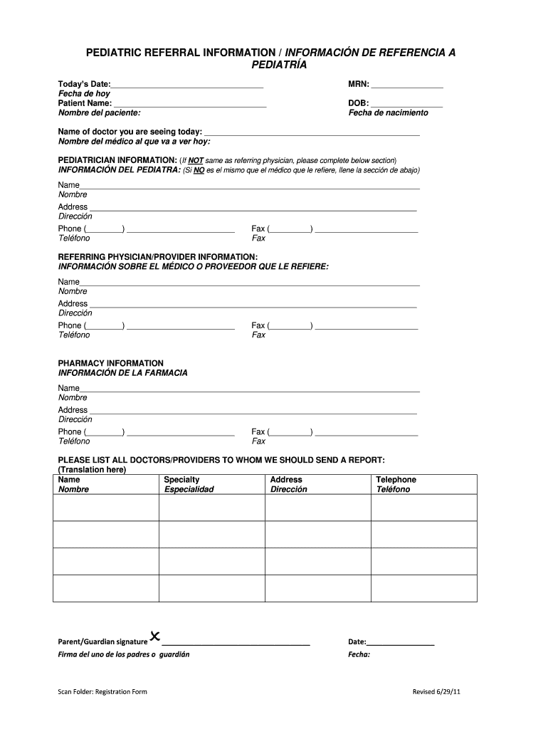 Scan Folder: Registration Form Revised 6×29/11 PEDIATRIC REFERRAL INFORMATION / INFORMATION DE References A PEDIATRIC Today's Date ...