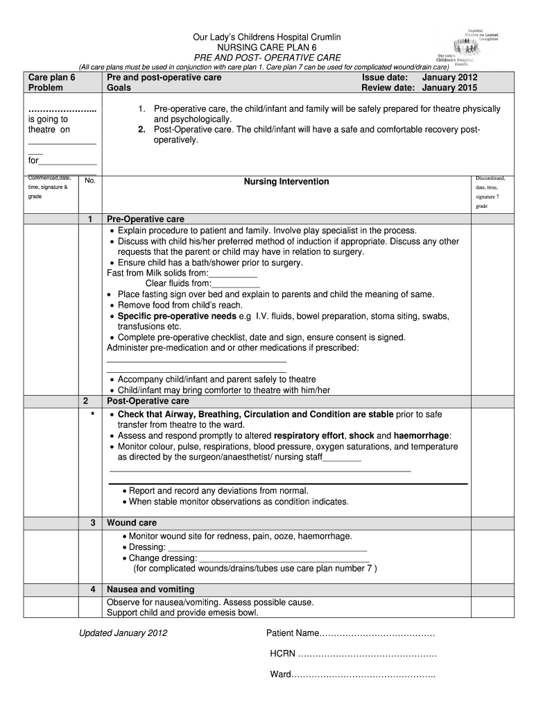 Get the free Pre and Post Op Care - Our Lady's Children's Hospital, Crumlin - olchc