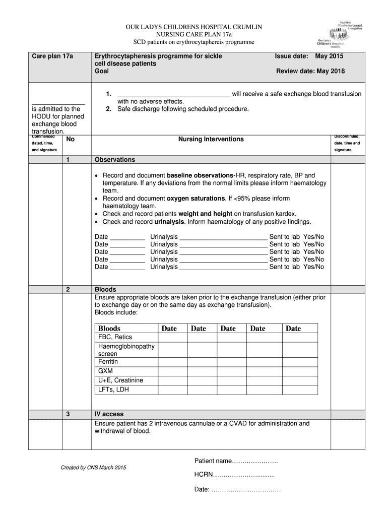 OUR LADY CHILDREN HOSPITAL DRUMLIN NURSING CARE PLAN 17a SCD patients on erythrocytaphereis program Care plan 17a is admitted to the HOD for planned exchange blood transfusion. Commenced No dated,