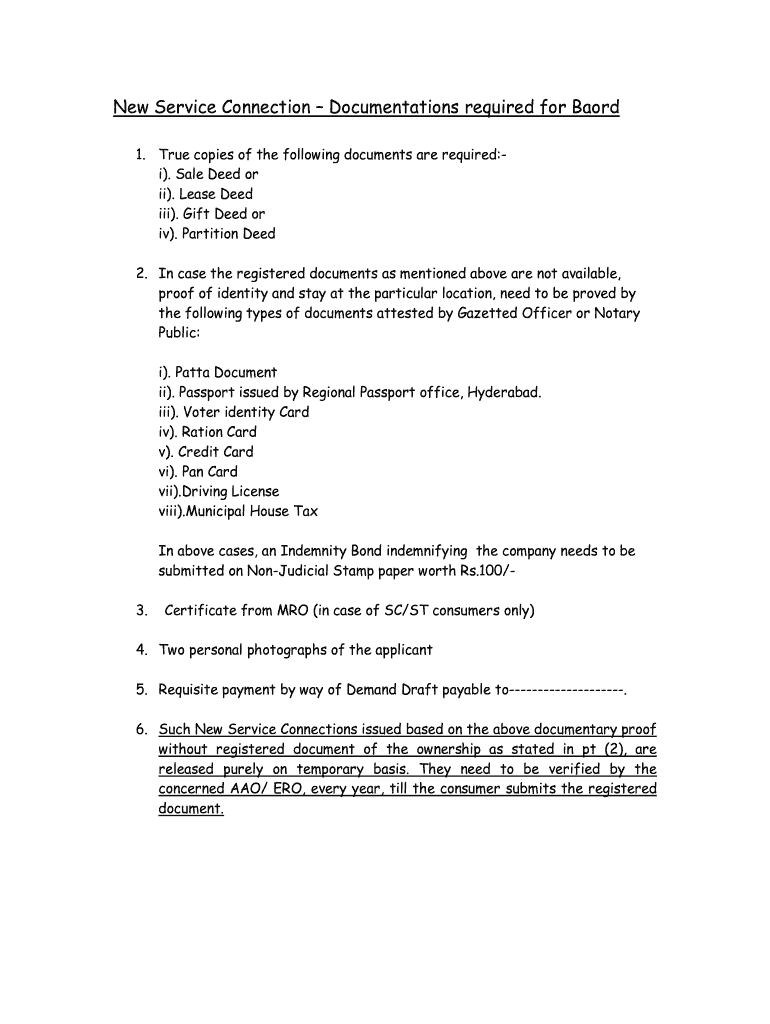 The specific requirements and documentations needed may vary depending on the service provider and the specific services being requested. It is important to contact the relevant authority or consult their guidelines for accurate and up-to-date information.