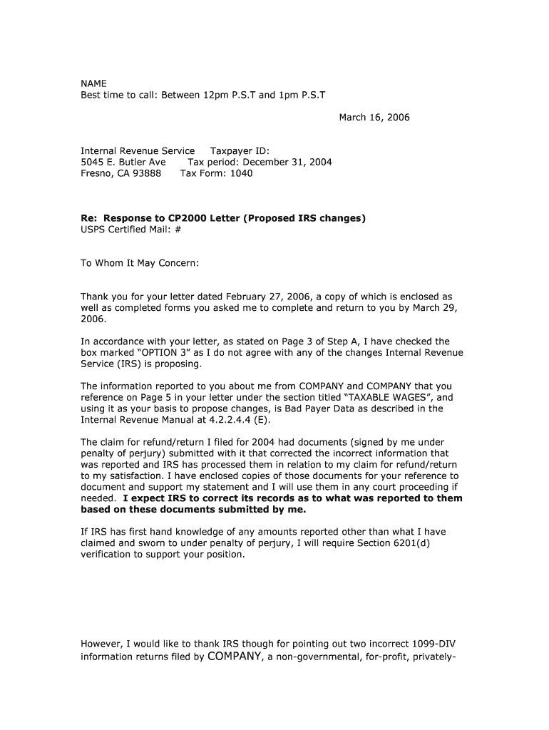 NAME Best time to call: Between 12pm P.S.T and 1pm P.S.T March 16, 2006, Internal Revenue Service Taxpayer ID: 5045 E. Butler Ave Tax period: December 31, 2004, Fresno, CA 93888 Tax Form: 1040 Re: