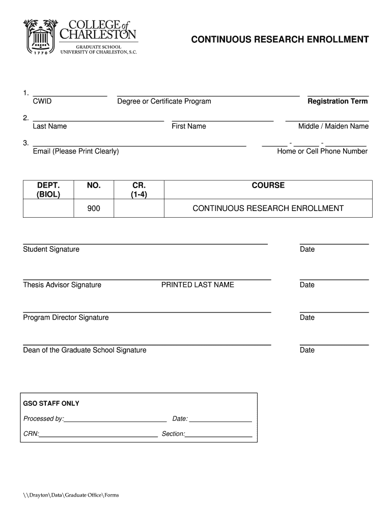 Get the free E2 Continuous Research Enrollment - College of Charleston - gradschool cofc