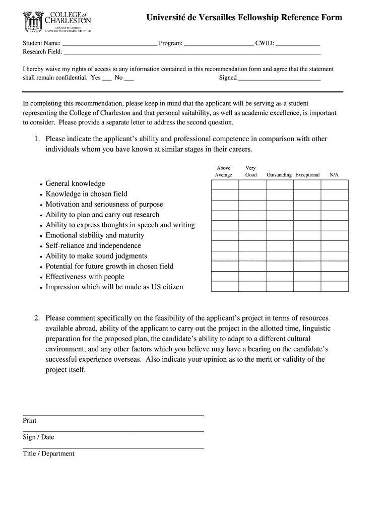 Get the free Universit de Versailles Fellowship Reference Form - gradschool cofc