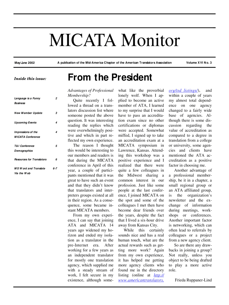 MIC ATA Monitors A publication of the mid-America Chapter of the American Translators Association May June 2002 From the President Inside this issue: Language is a Funny Business 2 New Member Update