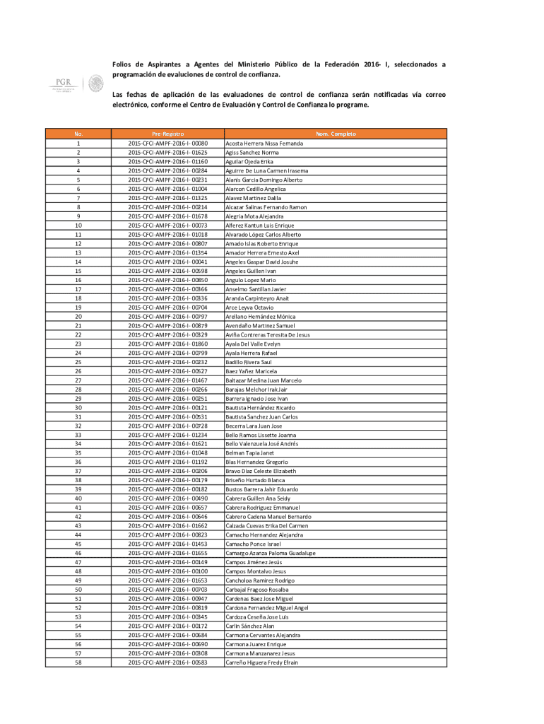 Folios de Aspirantes an Agents' Del Minister Public DE la Federation 2016 I, seleccionados a