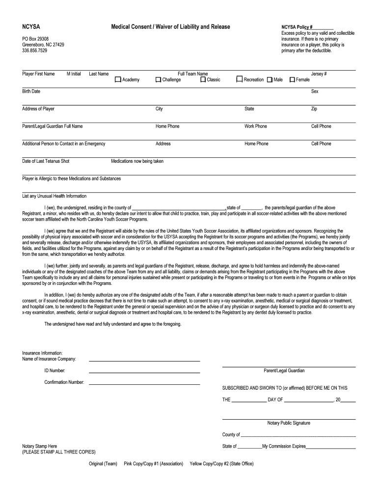 Participants of North Carolina Youth Soccer Association (NCYSA) events, programs, or activities may be required to complete a medical consent waiver. This includes players, coaches, volunteers, and other individuals involved in NCYSA-sanctioned events.