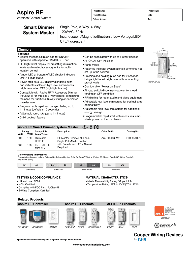 This document provides specifications, features, and compliance information for the Aspire RF Smart Dimmer System Master, including wiring diagrams and installation details.