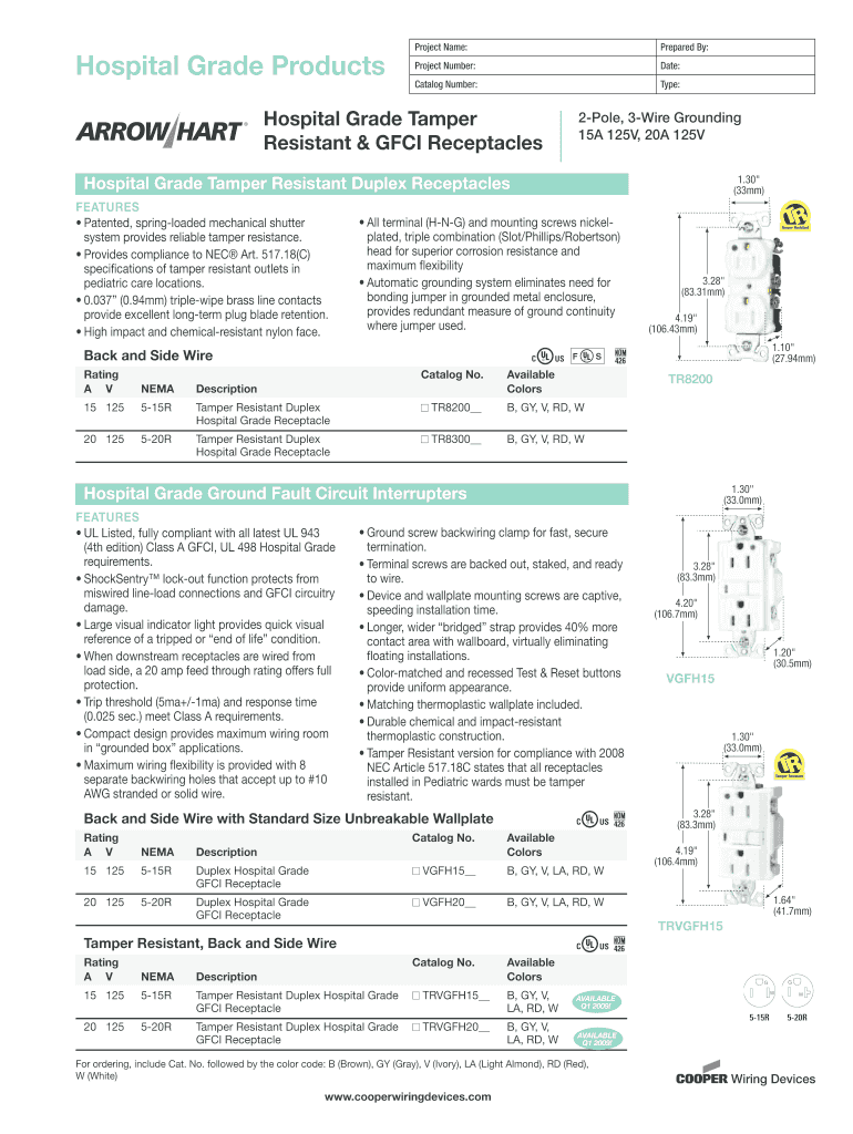 This document provides specifications, features, and compliance details for Hospital Grade Tamper Resistant and GFCI receptacles that meet safety requirements for pediatric care locations.