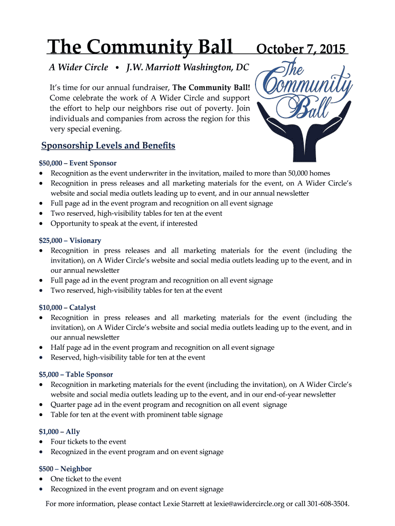 The Community Ball October 7, 2015, A Wider Circle J.W. Marriott Washington, DC It's time for our annual fundraiser, The Community Ball! Come celebrate the work of A Wider Circle and support the effort
