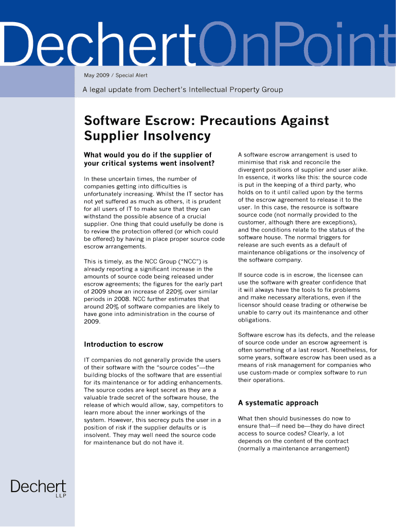 This document discusses the importance of software escrow arrangements to protect users from the risks associated with supplier insolvency, emphasizing the need for proper source code access and risk