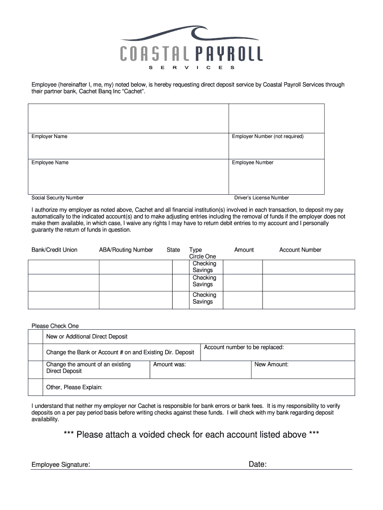 Employee (hereinafter I, me, my) noted below, is hereby requesting direct deposit service by Coastal Payroll Services through