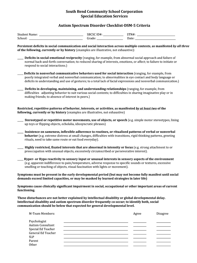 Get the free ASD DSM V Checklist 2103 final - Special Ed Home - SBCSC