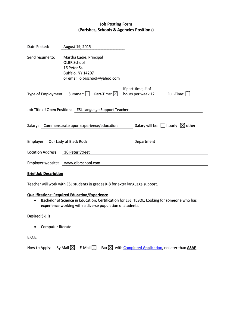 Job Posting Form (Parishes, Schools & Agencies Positions) Date Posted: August 19, 2015, Send resume to: Martha Eddie, Principal OR School 16 Peter St. Buffalo, NY 14207 or email: playschool yahoo.com