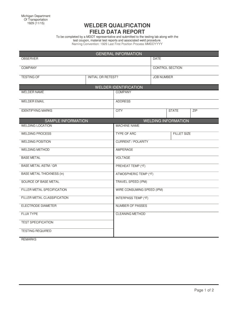 Michigan Department Of Transportation 1929 11 15) WELDER QUALIFICATION FIELD DATA REPORT To be completed by a DOT representative and submitted to the testing lab along with the test coupon, material