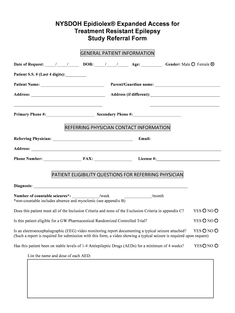 NYS DOH Epidote Expanded Access for Treatment Resistant Epilepsy Study Referral Form GENERAL PATIENT INFORMATION Date of Request: / / DOB: / / Age: Gender: Male Female Patient S.S. # (Last 4 digits):
