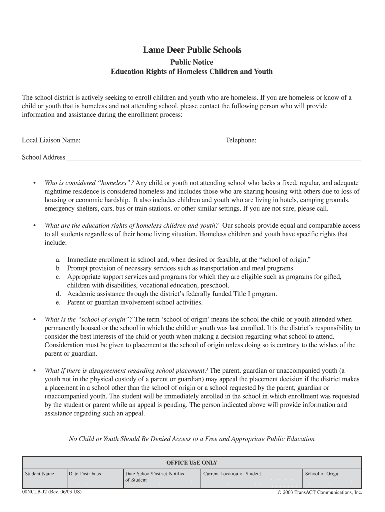 Lame Deer Public Schools Public Notice Education Rights of Homeless Children and Youth The school district is actively seeking to enroll children and youth who are homeless. If you are homeless or