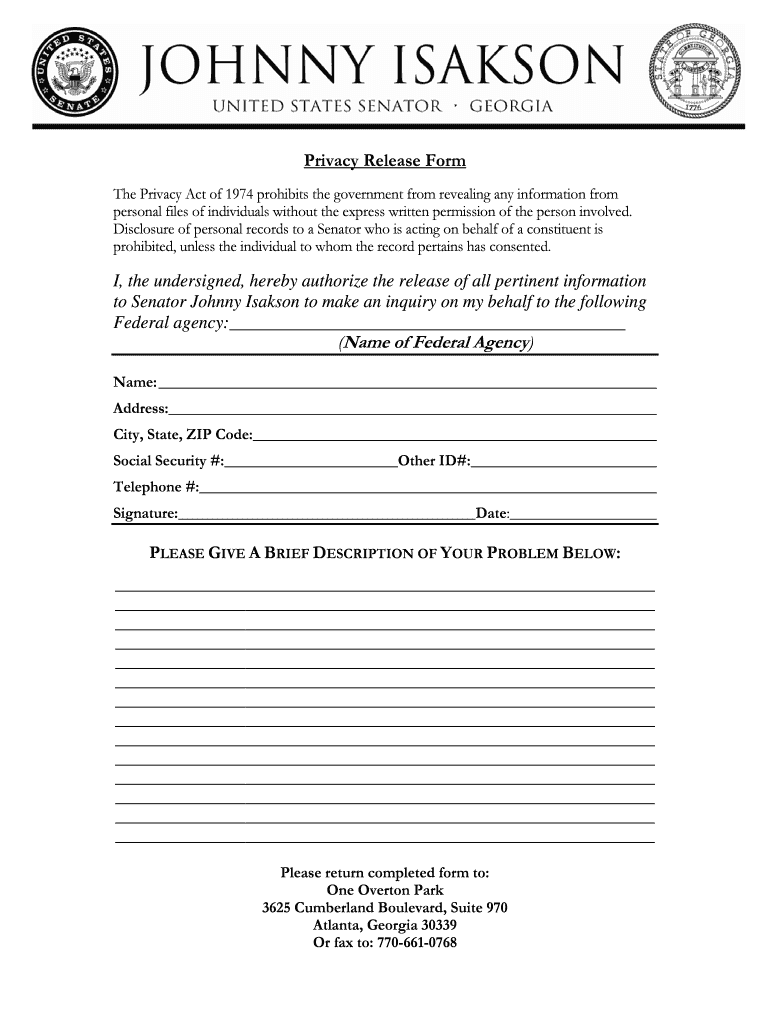 Get the free Privacy Release Form - bSenateb - isakson senate