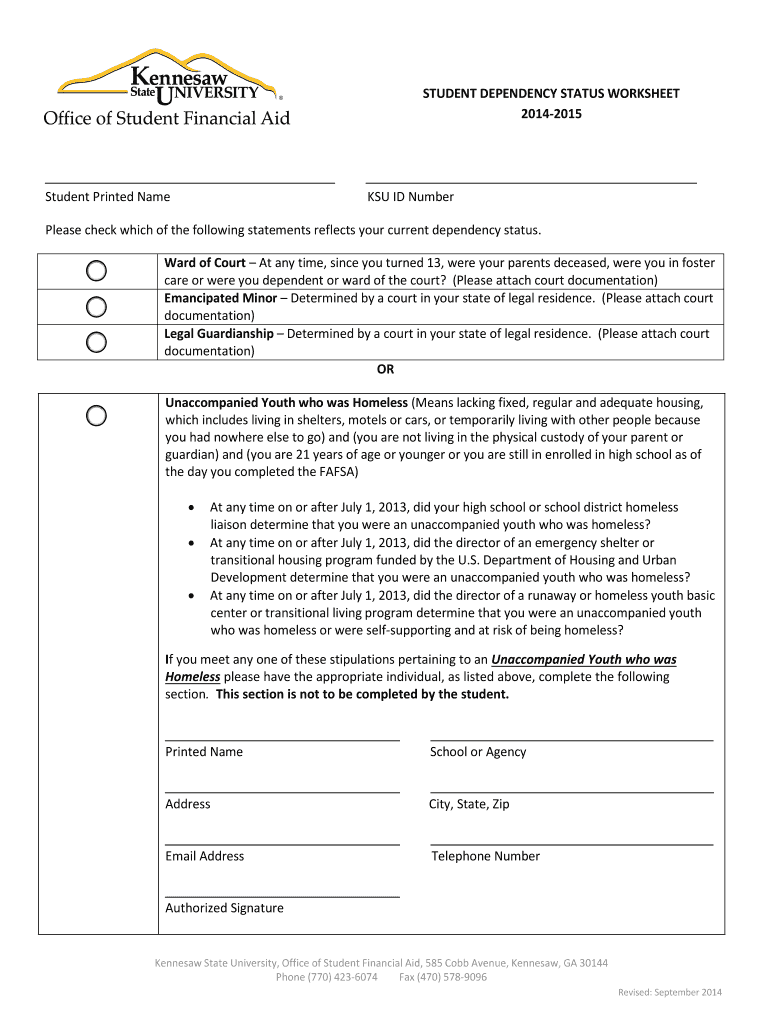 Get the free STUDENT DEPENDENCY STATUS WORKSHEET - financialaid kennesaw