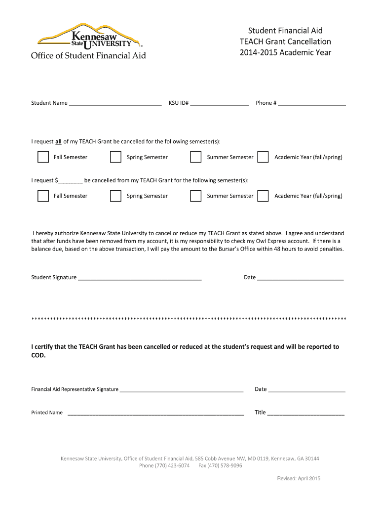 Get the free Student Financial Aid TEACH Grant Cancellation 2014-2015 ... - financialaid kennesaw