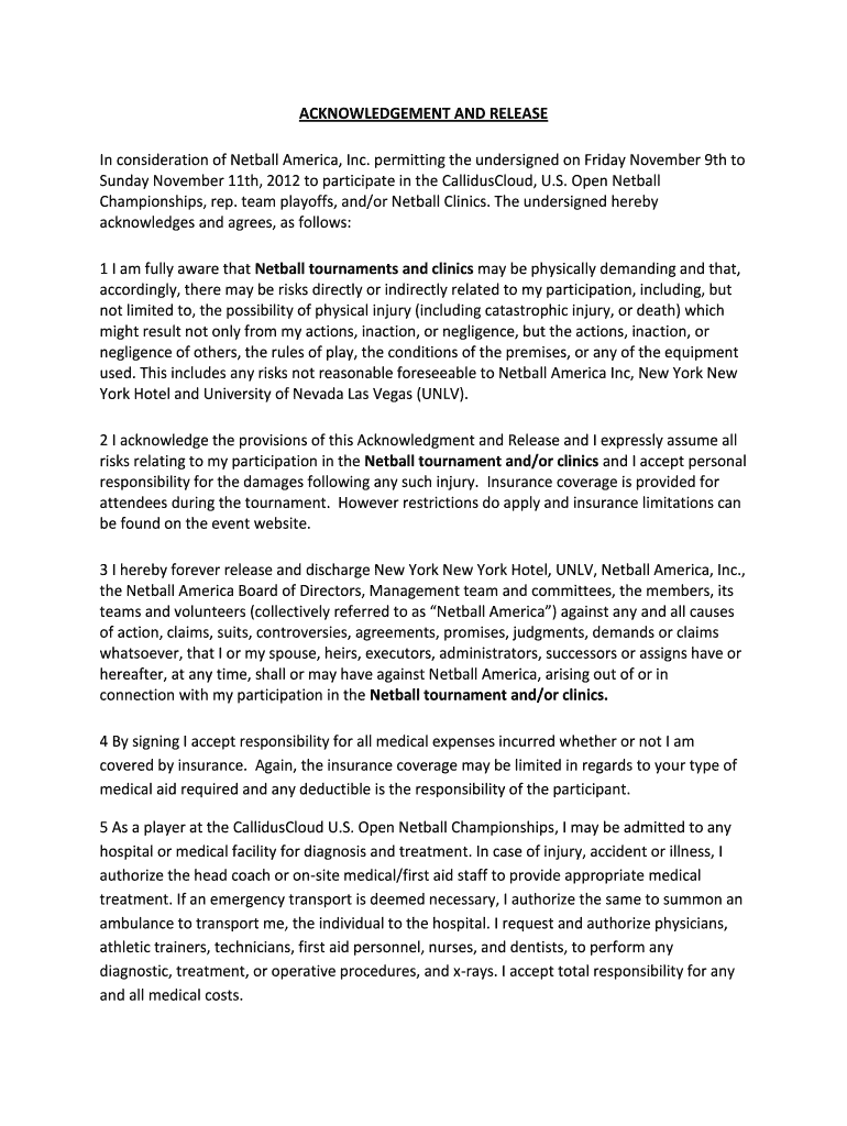 This document serves as an acknowledgment and release form for participants in the CallidusCloud U.S. Open Netball Championships, outlining the risks involved in the event and releasing Netball America