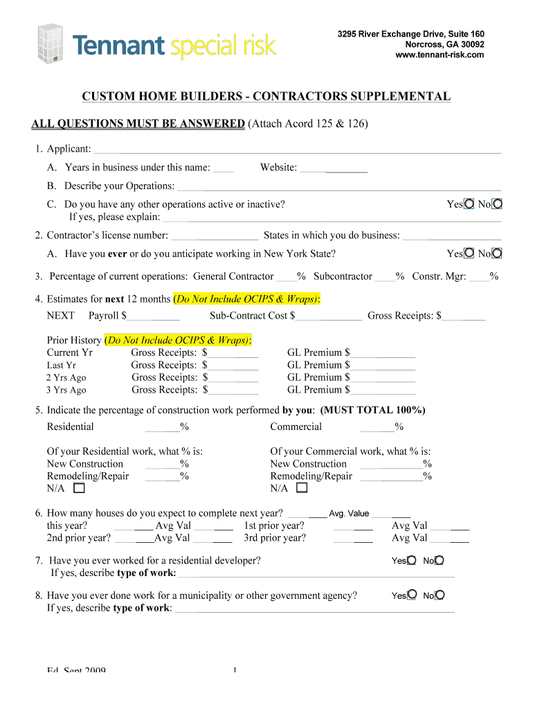 The Custom Home Builders Contractors Supplemental Form is essential for contractors to provide comprehensive details about their business operations. It serves as a crucial document for gathering necessary information for insurance underwriting processes. By completing this form, contractors help insurance providers assess their risk and determine coverage options.