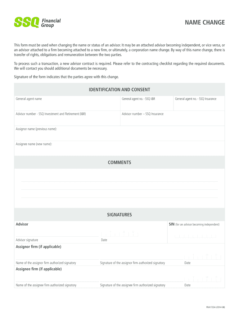 NAME CHANGE This form must be used when changing the name or status of an advisor. It may be an attached advisor becoming independent, or vice versa, or an advisor attached to a firm becoming attached
