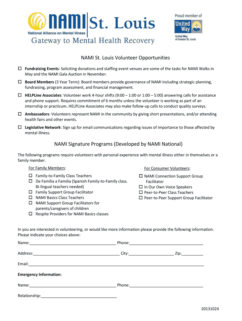Anyone who wishes to volunteer with NAMI St. Louis may be required to fill out a volunteer application form.