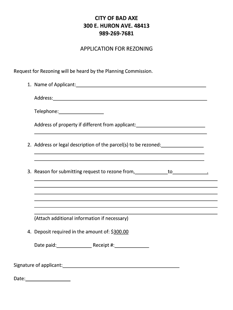 CITY OF BAD AXE. 300 E. HURON AVE. 48413. 9892697681. APPLICATION FOR REZONING. Request for Rezoning will be heard by the Planning Commission. 1.