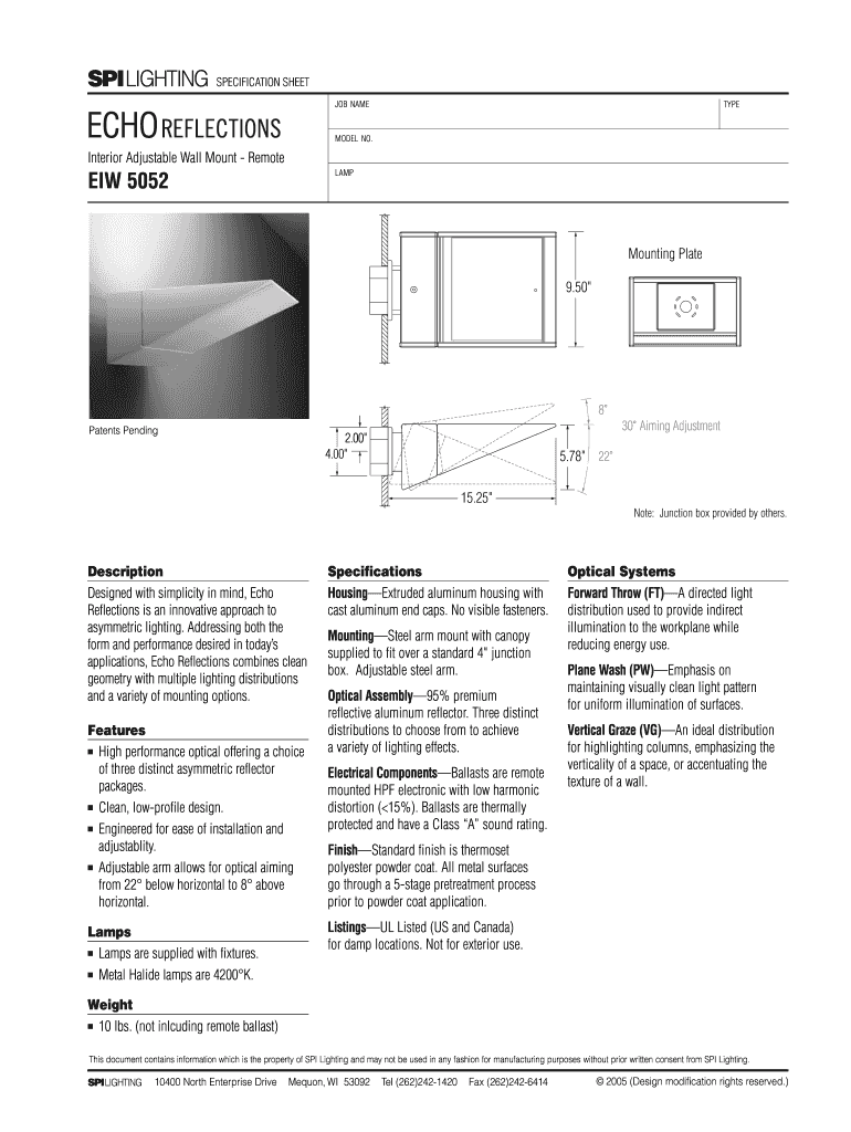 SPOTLIGHTING SPECIFICATION SHEET JOB NAME TYPE MODEL NO. Interior Adjustable Wall Mount Remote LAMP EIC 5052 Mounting Plate 9.50 8 30 Aiming Adjustment Patents Pending 2.00 4.00 5.78 22 15.25 Note: