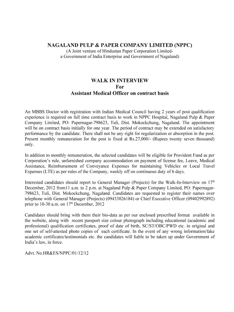 NAGALAND PULP & PAPER COMPANY LIMITED (NPC) (A Joint venture of Hindustan Paper Corporation Limited Government of India Enterprise and Government of Nagaland) WALK IN INTERVIEW For Assistant Medical