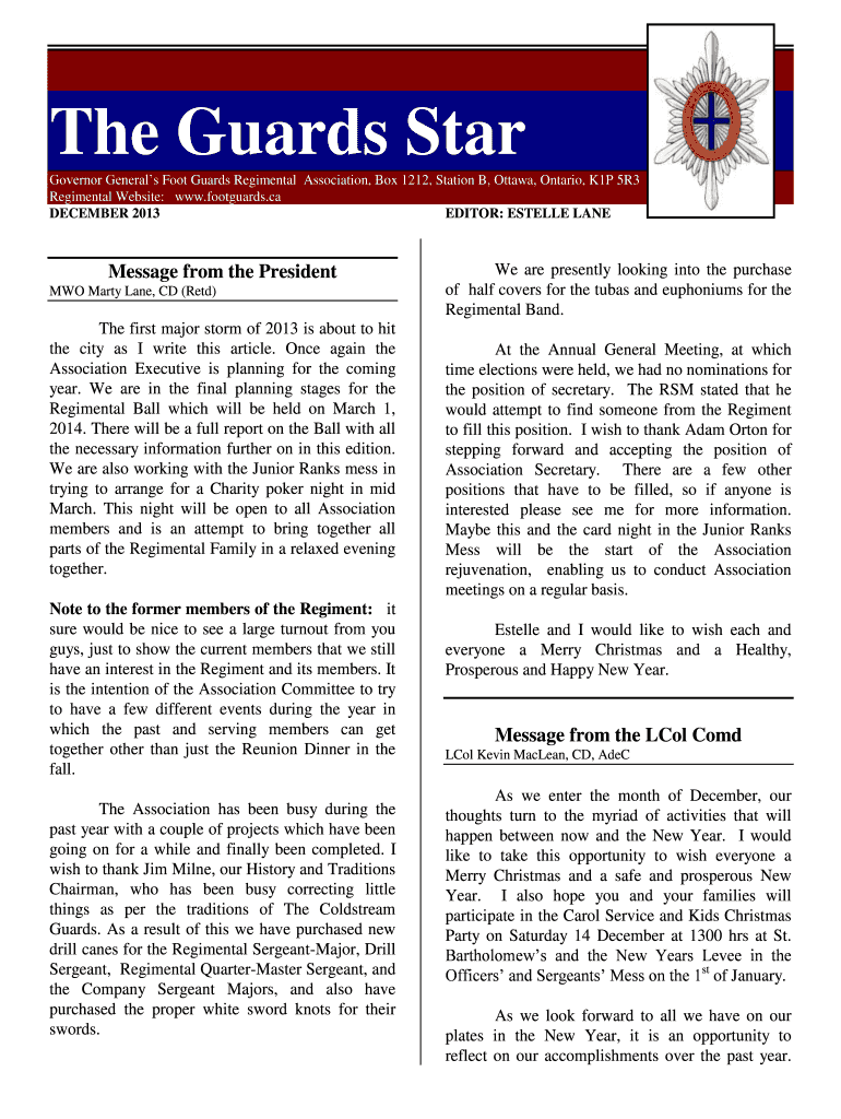 The Guards Star Governor Generals Foot Guards Regimental Association, Box 1212, Station B, Ottawa, Ontario, K1P 5R3 Regimental Website: www.footguards.ca DECEMBER 2013 EDITOR: ESTELLE LANE Message