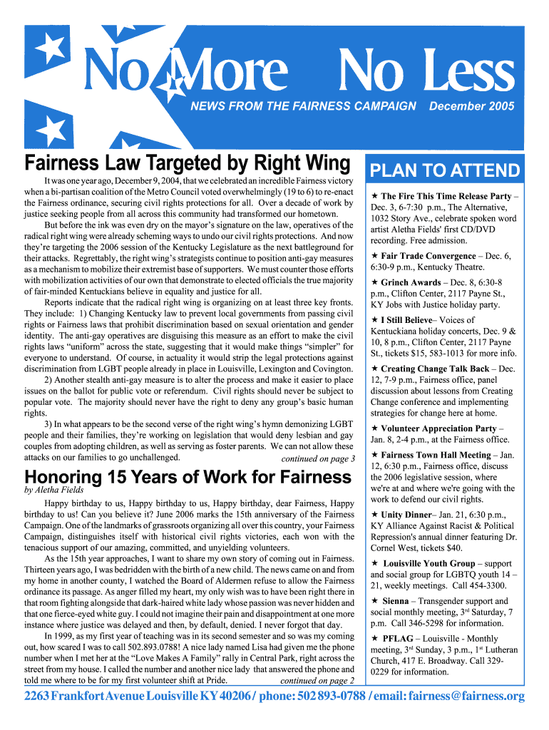 NEWS FROM THE FAIRNESS CAMPAIGN December 2005 Fairness Law Targeted by Right Wing PLAN TO ATTEND It was one year ago, December 9, 2004, that we celebrated an incredible Fairness victory when a bi-partisan